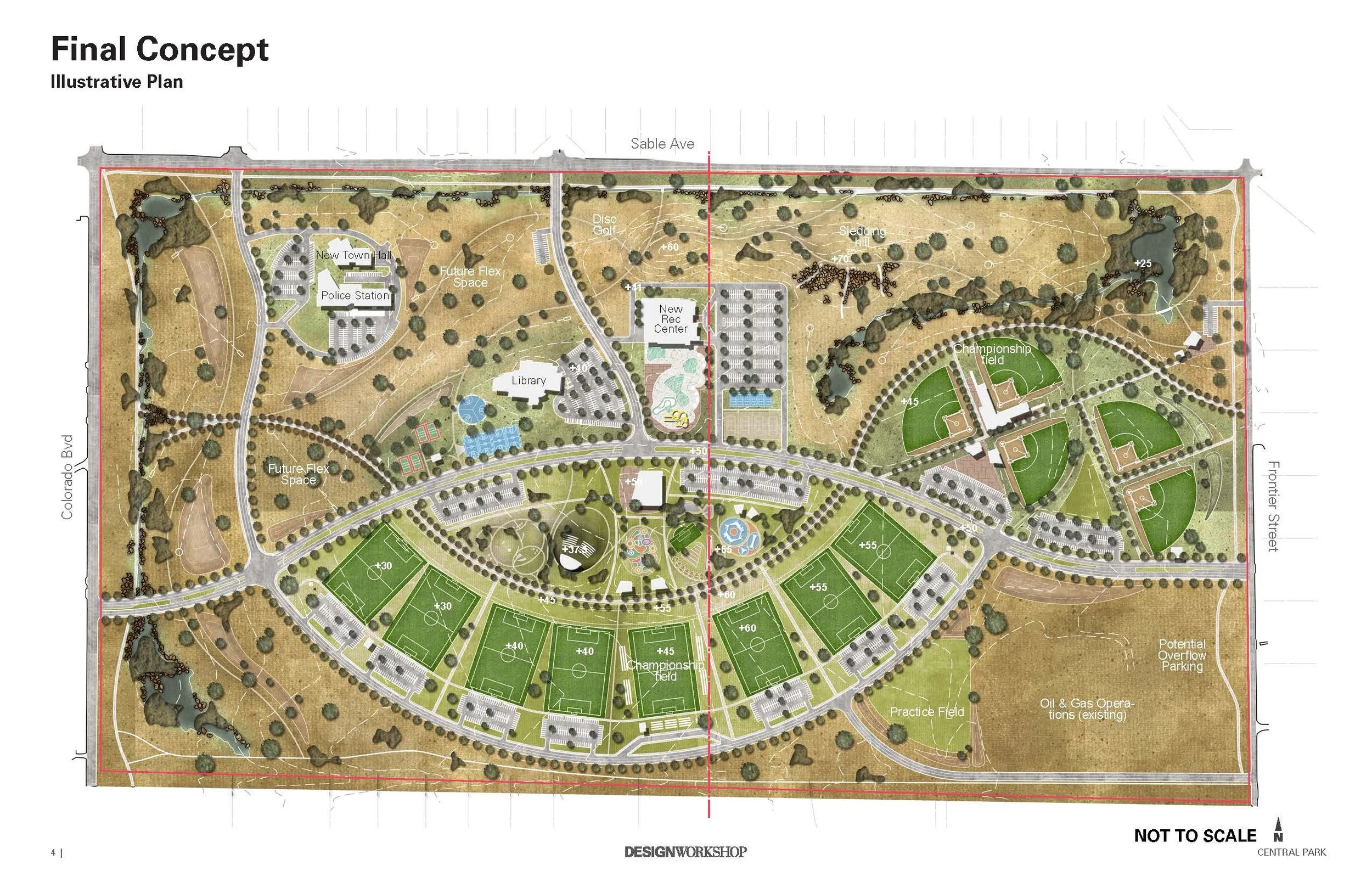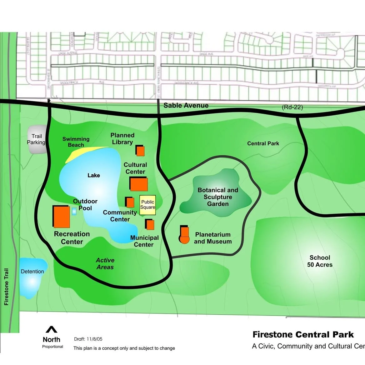 Central Park has always been presented as Firestone’s future gathering place — a 252-acre property purchased in 2005 to serve as a hub for recreation, community, and open space. Over the years, residents have shared their vision through meetings, surveys, and master planning sessions, consistently calling for trails, playgrounds, local athletic fields, and spaces for families to come together.